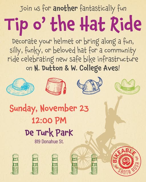 The city of Santa Rosa is in the process of installing many new miles of separated bike lanes in Northwest Santa Rosa. Join Bikeable Santa Rosa in thanking the city for these investments at its second-ever Tip o' the Hat Ride on Sunday, Nov. 23. Bring a crazy, fun hat to wear or decorate your helmet! Extra hats and helmet decorations will be provided for those who need them.
